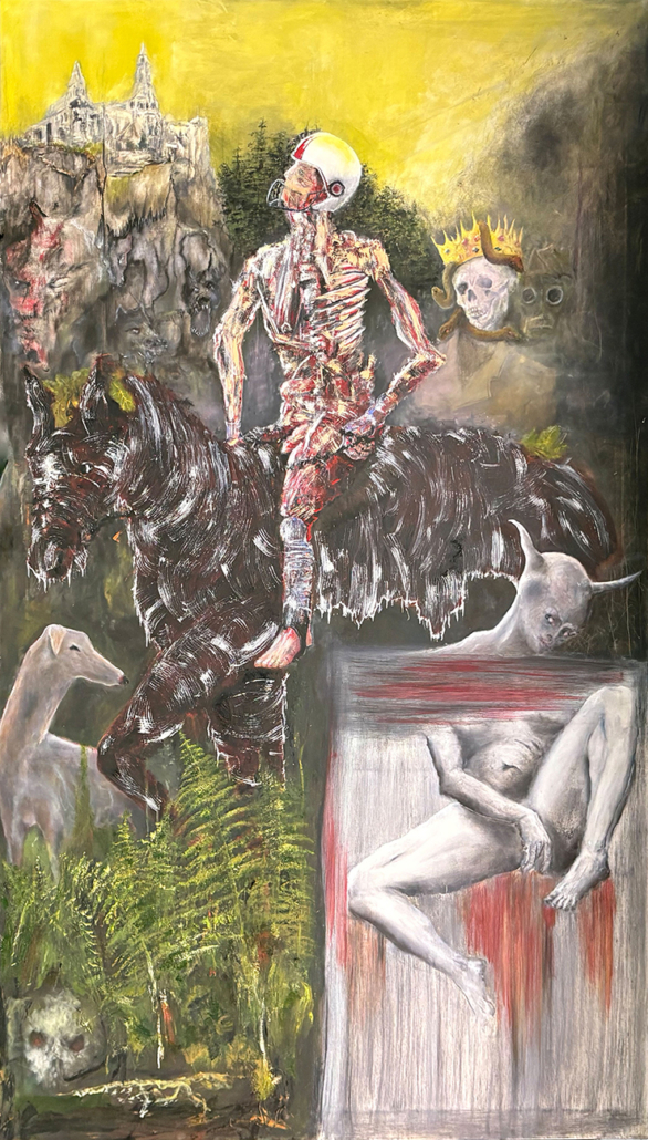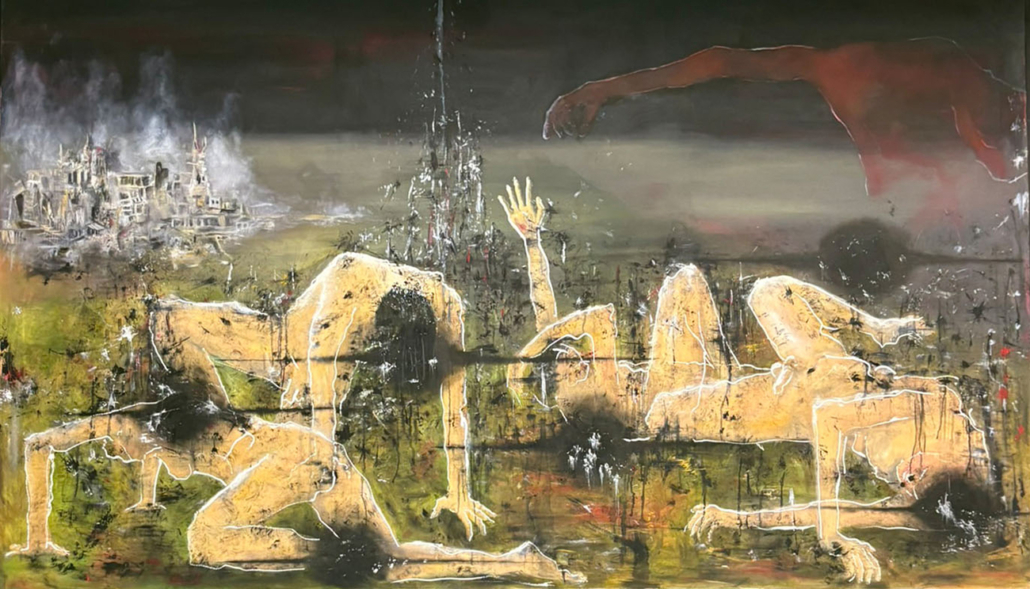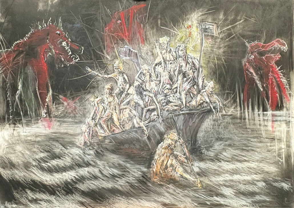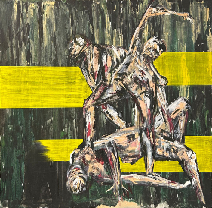 Die Figuren befinden sich in einem Zustand zwischen Bewegung und Erstarrung. Sie scheinen Kräften ausgesetzt, die sich ihrer Kontrolle entziehen, und verweisen auf existenzielle Spannungen zwischen Präsenz und Auflösung, Aktion und Stillstand. Es ist ein Ort des Ausgeliefertseins, an dem Unsicherheit, Vergänglichkeit, Eros und Aggression gleichzeitig wirksam werden.